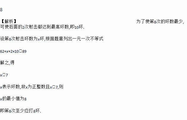 8 ¡¾½âÎö¡¿ÎªÁËʹµÚ8´ÎµÄ»·Êý×îÉÙ,¿ÉʹºóÃæµÄ2´ÎÉä»÷¶¼´ïµ½×î¸ß»·Êý,¼´10»·. ÉèµÚ8´ÎÉä»÷»·ÊýΪx»·,¸ù¾ÝÌâÒâÁгöÒ»ÔªÒ»´Î²»µÈʽ 62+x+2¡Á10£¾89 ½âÖ®,µÃ x£¾7 x±íʾ»·Êý,¹ÊxΪÕýÕûÊýÇÒx£¾7,Ôò xµÄ×îСֵΪ8 ¼´µÚ8´ÎÖÁÉÙÓ¦´ò8»·.