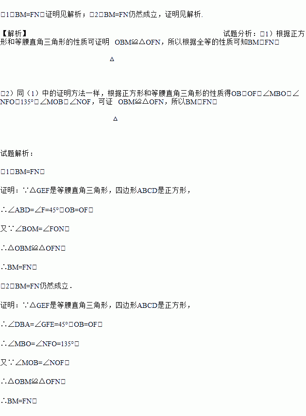 (1)如图2,当EF与AB相交于点M,GF与BD相交于点N时判断线段BM、FN的长度关系,并证明之;