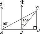 分析:由已知画出图形,在A处看见小岛C在船北偏东60°的方向上,得到∠DAC=30°,小岛C在船北偏东30°的方向上,得到∠DBC=60°,还可以得出∠ACB=30°,所以AB=BC,再利用三角函数关系求出CD.