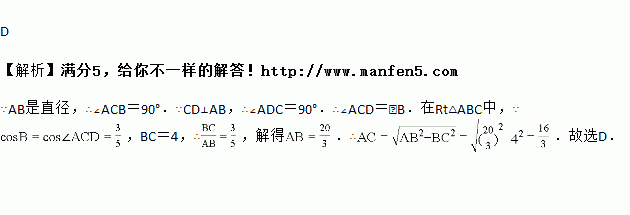 如图是以△ABC的边AB为直径的半圆O,点C恰好在半圆上,过C作CD⊥AB交AB于D.已知cos∠ACD=,BC=4,则AC的长为( )