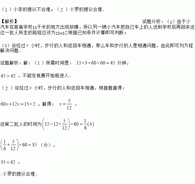 名师生同时步行前往,小轿车到达考场后再返回途中接送其他人.你认为小罗的提议合理吗?通过计算说明理由.