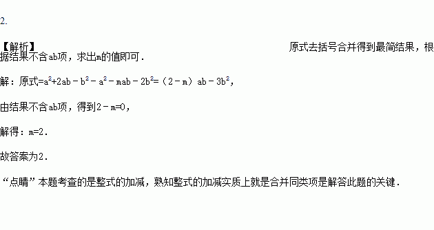 若关于a,b的多项式(a2+2ab-b2)-(a2+mab+2b2)中不含ab项,则m = .