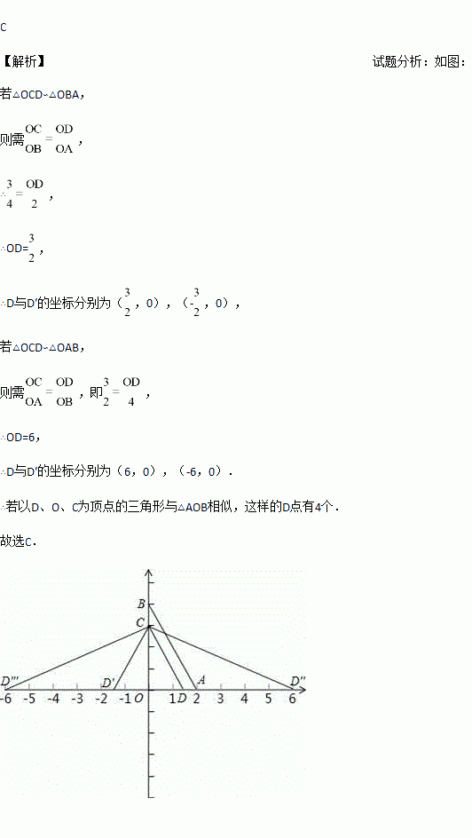 在直角坐标系中,已知O(0,0),A(2,0),B(0,4),C(0,3),D为x轴上一点,若以D、O、C为顶点的三角形与△AOB相似,这样的D点有( )