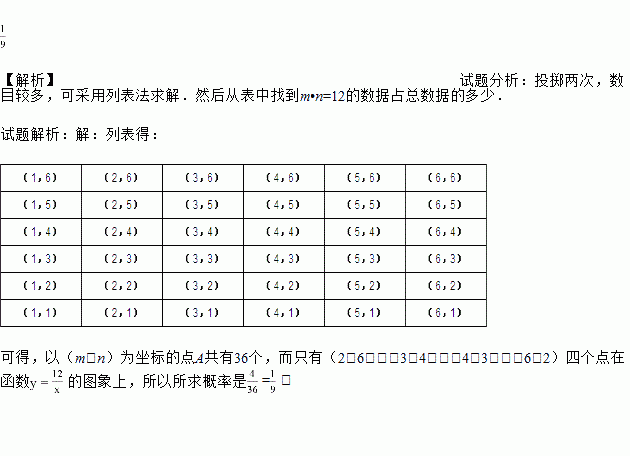 一枚均匀的正方体骰子,六个面分别标有数字1、2、3、4、5、6,连续抛掷两次,朝上的数字分别是m、n,若把m、n作为点的横、纵坐标,那么点A(m,n)在函数y = 的图象上的概率是多少?