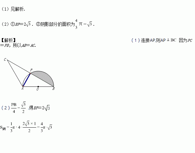 (2)若AB=4,∠ABC=30°.①求弦BP的长. ②求阴影部分的面积