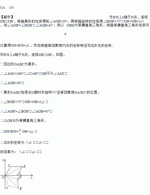 如图,在平面直角坐标系xOy中,菱形OABC的边长为2,点A在第一象限,点C在x轴正半轴上,∠AOC=60°,若将菱形OABC绕点O顺时针旋转75°,得到四边形OA′B′C′,则点B的对应点B′的坐标为_____.
