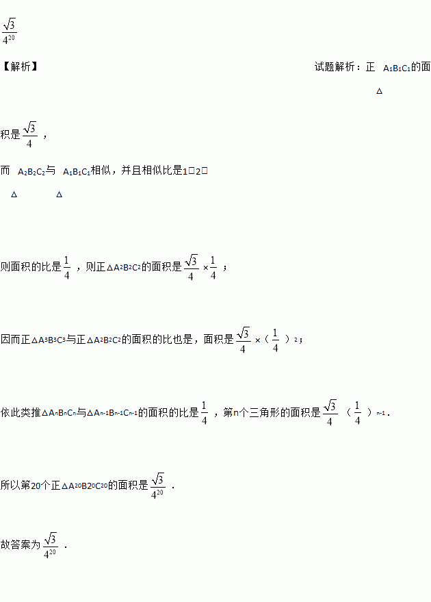 如图,小强作出边长为1的第1个等边△A1B1C1,计算器面积为S1,然后分别取△A1B1C1三边的中点A2、B2、C1,作出第2个等边△A2B2C2,计算其面积为S2,用同样的方法,作出第3个等边△A3B3C3,计算其面积为S3,按此规律进行下去,…,由此可得,第20个等边△A20B20C20的面积S20=________.