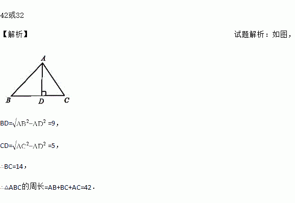 在△ABC中,AB=15,AC=13,高AD=12,则△ABC的周长为____________.