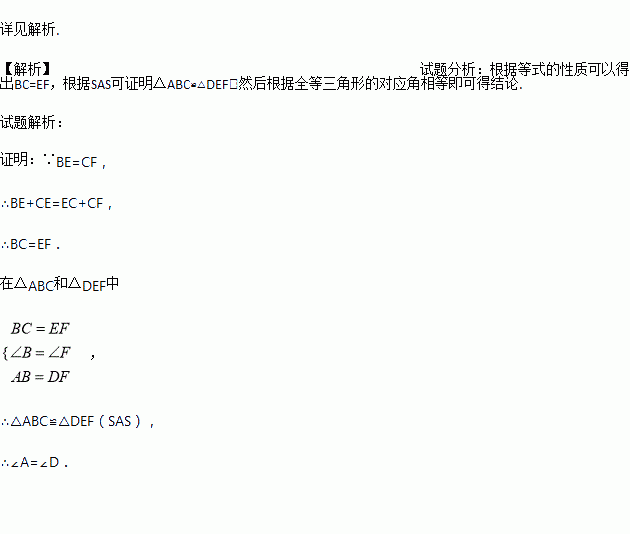 如图,点E,C在BF上,BE=CF,AB=DF,∠B=∠F.求证:∠A=∠D.