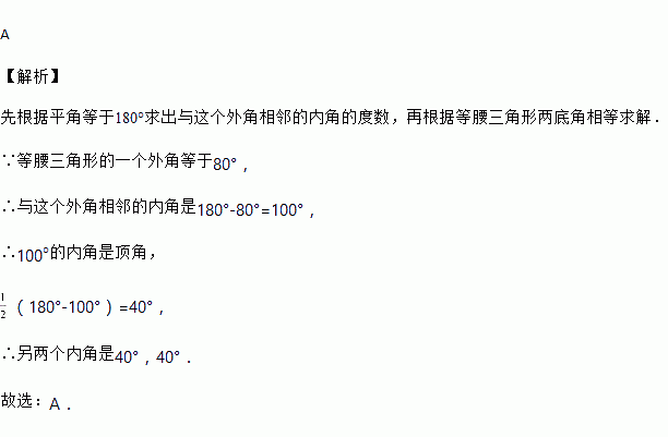 等腰三角形的一个外角等于,则与它不相邻的两个内角的度数分别为