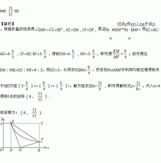 (k>0)的图象与AC边交于点E.若将△CEF沿EF翻折后,点C恰好落在OB上的点D处,则点F的坐标为_____.