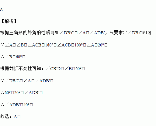 如图,在△ABC中,∠ACB=100°,∠A=20°,D是AB上一点,将△ABC沿CD折叠,使B点落在AC边上的B′处,则∠ADB′等于( )
