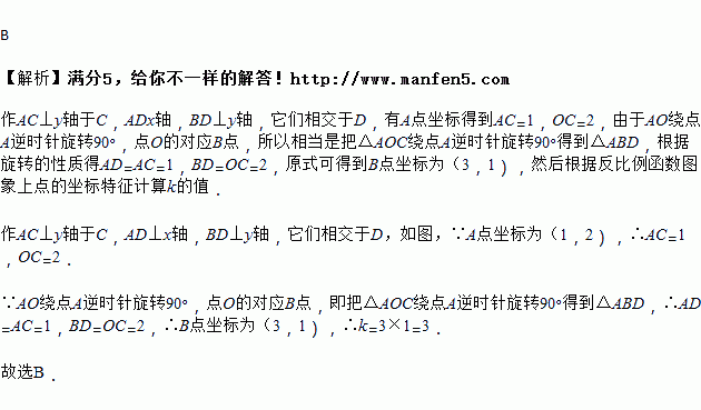 如图,平面直角坐标中,点A(1,2),将AO绕点A逆时针旋转90°,点O的对应点B恰好落在双曲线y=