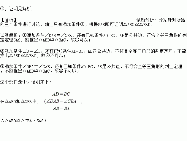 如图,在△ABC和△BAD中,AC与BD相交于点E,已知AD=BC,另外只能从下面给出的三个条件:①∠DAB=∠CBA;②∠D=∠C;③∠DBA=∠CAB中选择其中的一个用来证明△ABC和△BAD全等,这个条件是 (填序号),并证明△ABC≌△BAD.