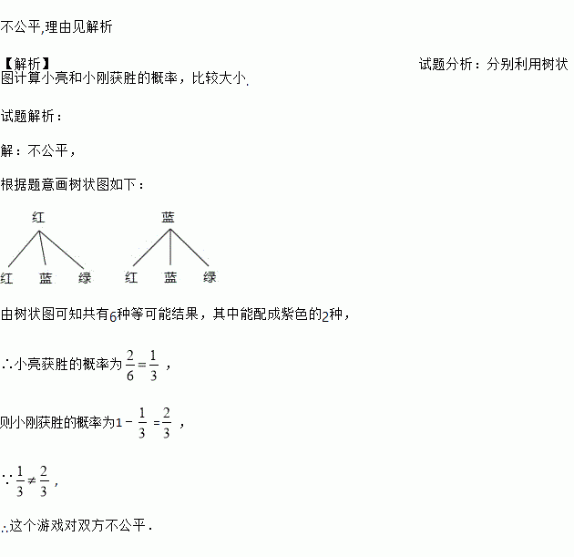 用如图所示的A,B两个转盘进行“配紫色”游戏(红色和蓝色在一起就配成了紫色,其中A盘中红色和蓝色均为半圆,B盘中红色、蓝色、绿色所在扇形圆心角均为120度).小亮和小刚同时用力转动两个转盘,当转盘停下时,两枚指针停留的区域颜色刚好配成紫色时小亮获胜,否则小刚获胜.判断这个游戏对双方是否公平,并借助树状图或列表说明理由.