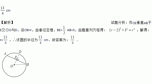 如图,一宽为2cm的刻度尺在圆上移动,当刻度尺的一边与圆相切时,另一边与圆两个交点处的读数恰好为“2”和“8”(单位:cm),则该圆的半径为_____cm.
