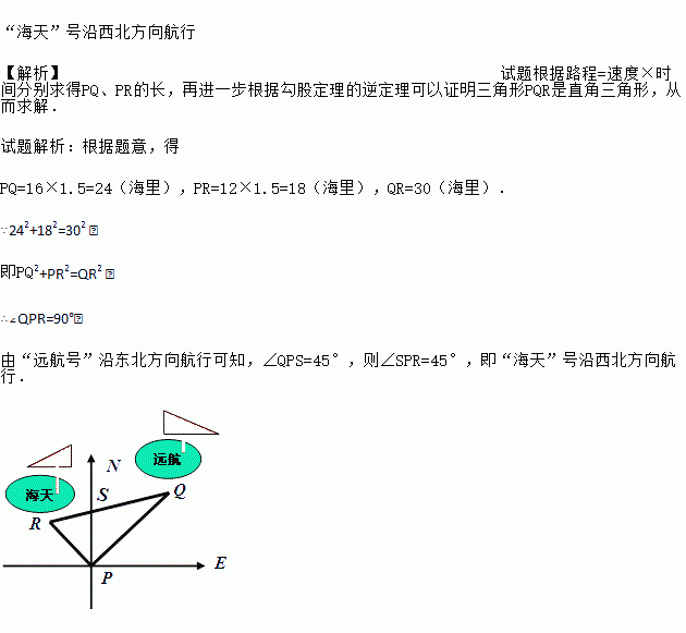 某港口位于东西方向的海岸线上.“远航”号、“海天”号轮船同时离开港口,各自沿一固定方向航行,“远航”号每小时航行16海里,“海天”号每小时航行12海里.它们离开港口一个半小时后相距30海里.如果知道“远航”号沿东北方向航行,能知道“海天”号沿哪个方向航行?为什么?
