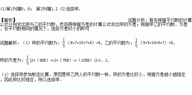 为了从甲、乙两人中选拔一人参加射击比赛,现对他们的射击成绩进行了测试,5次打靶命中的环数如右:甲:8,7,10,7,8; 乙:9,5,10,9,7.