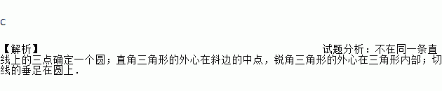 C 【解析】试题分析:不在同一条直线上的三点确定一个圆;直角三角形的外心在斜边的中点,锐角三角形的外心在三角形内部;切线的垂足在圆上.