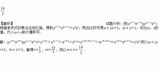 若(am+1bn+2)(a2n-1b2n)=a5b3,求m+n的值.