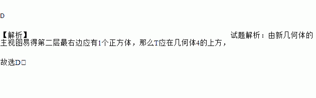 D 【解析】试题解析:由新几何体的主视图易得第二层最右边应有1个正方体,那么T应在几何体4的上方, 故选D.