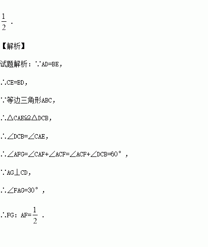 如图,等边三角形ABC中,D、E分别为AB、BC边上的两动点,且总使AD=BE,AE与CD交于点F,AG⊥CD于点G,则= .