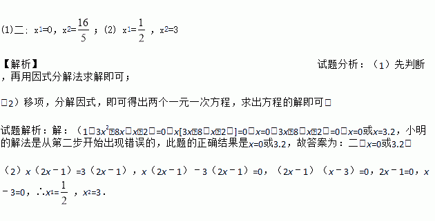 (1)二; x1=0,x2=;(2) x1=,x2=3 【解析】试题分析:(1)先判断,再用因式分解法求解即可; (2)移项,分解因式,即可得出两个一元一次方程,求出方程的解即可. 试题解析:【解析】 (1)3x2﹣8x(x﹣2)=0,x[3x﹣8(x﹣2)]=0,x=0,3x﹣8(x﹣2)=0,x=0或x=3.2,小明的解法是从第二步开始出现错误的,此题的正确结果是x=0或3...