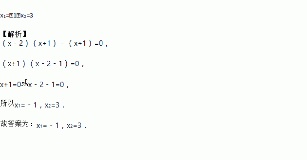 x1=﹣1,x2=3 【解析】(x﹣2)(x+1)﹣(x+1)=0, (x+1)(x﹣2﹣1)=0, x+1=0或x﹣2﹣1=0, 所以x1=﹣1,x2=3. 故答案为:x1=﹣1,x2=3.