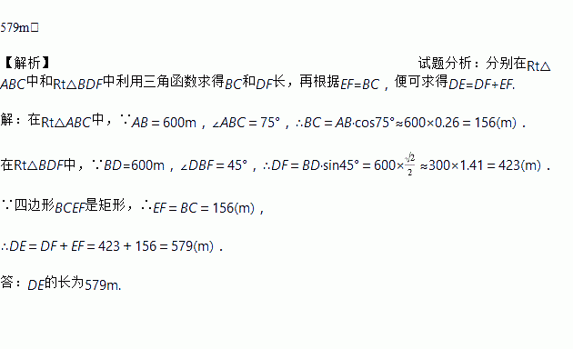 (2017安徽省)如图,游客在点A处做缆车出发,沿A﹣B﹣D的路线可至山顶D处,假设AB和BD都是直线段,且AB=BD=600m,α=75°,β=45°,求DE的长.