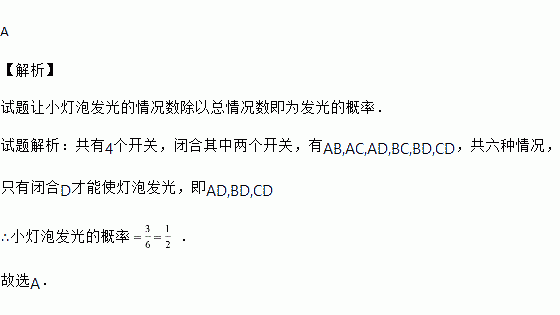 如图,电路图上有四个开关A、B、C、D和一个小灯泡,闭合开关D或同时闭合开关A、B、C都可使小灯泡发光,则任意闭合其中两个开关,小灯泡发光的概率是( )