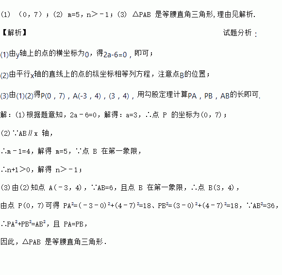 (1) (0,7);(2) m=5,n>﹣1;(3) △PAB 是等腰直角三角形,理由见解析. 【解析】试题分析: (1)由y轴上的点的横坐标为0,得2a-6=0,即可; (2)由平行x轴的直线上的点的纵坐标相等列方程,注意点B的位置; (3)由(1)(2)得P(0,7),A(-3,4),(3,4),用勾股定理计算PA,PB,AB的长即可. 【解析】 (1)根据题意...