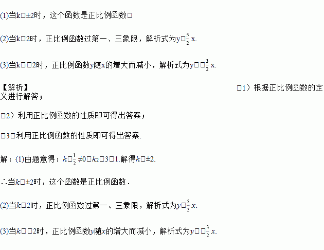 (2)k为何值时,正比例函数过第一、三象限,写出正比例函数解析式;