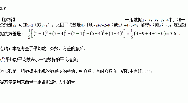 一组数据2,7,x,y,4中,唯一众数是2,平均数是4,这组数据的方差是____.