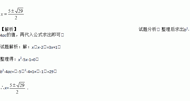 【解析】试题分析: 整理后求出b2-4ac的值,再代入公式求出即可. 试题解析:【解析】 x(x-2)=3x+1, 整理得:x2-5x-1=0, b2-4ac=(-5)2-4×1×(-1)=29, ∴x=.