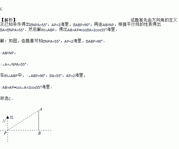 如图,一艘海轮位于灯塔P的北偏东55°方向,距离灯塔2海里的点A处,如果海轮沿正南方向航行到灯塔的正东方向,海轮航行的距离AB长是( )