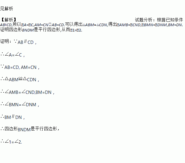 如图,点M,N在线段AC上,AM=CN,AB∥CD,AB=CD.求证:∠1=∠2.