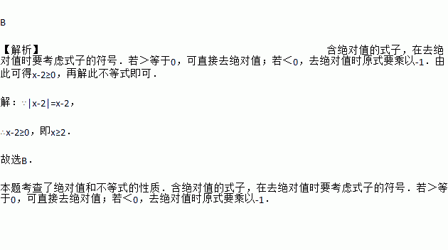 B 【解析】含绝对值的式子,在去绝对值时要考虑式子的符号.若>等于0,可直接去绝对值;若<0,去绝对值时原式要乘以-1.由此可得x-2≥0,再解此不等式即可. 【解析】 ∵|x-2|=x-2, ∴x-2≥0,即x≥2. 故选B. 本题考查了绝对值和不等式的性质.含绝对值的式子,在去绝对值时要考虑式子的符号.若>等于0,可直接去绝对值;若<0,去绝对值时原式要乘以-1...