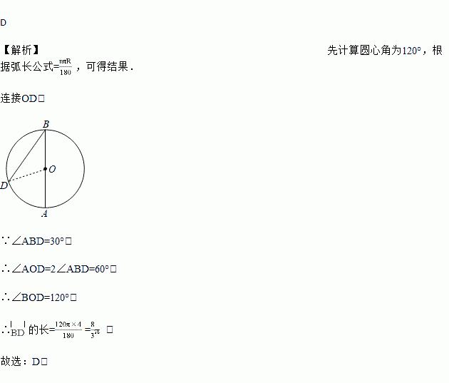 如图,AB是⊙O的直径,点D为⊙O上一点,且∠ABD=30°,BO=4,则 的长为( )