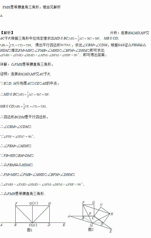 在图1、图2中,线段AC=CE,点B是线段AC的中点,点D是线段CE的中点,四边形BCGF和CDHN都是正方形,AE的中点是M.如图1,点E在AC的延长线上,点N与点G重合时,点M与点C重合,容易证明FM=MH,FM⊥HM;现将图1的CE绕点C顺时针旋转一个锐角,得到图2,判断△FMH的形状,并证明你的结论.