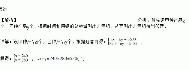 某厂生产甲、乙两种型号的产品,生产甲种产品1个需用时8s、铜8g;生产乙种产品1个的型号需用时6s、铜16g.如果生产甲、乙两种产品共用时1h、用铜6.4kg,那么甲、乙两种产品共生产了________个.