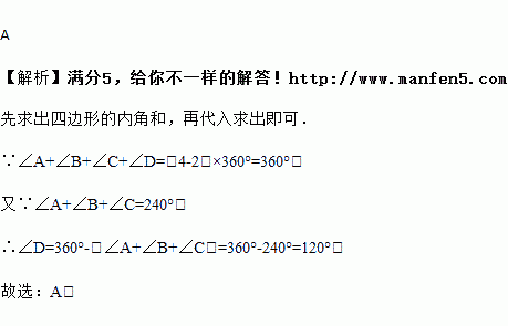 如图,在四边形ABCD中,如果∠A+∠B+∠C=240°,那么∠D的度数为( )