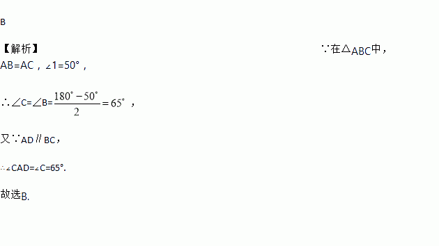 B 【解析】∵在△ABC中,AB=AC,∠1=50°, ∴∠C=∠B=, 又∵AD∥BC, ∴∠CAD=∠C=65°. 故选B.