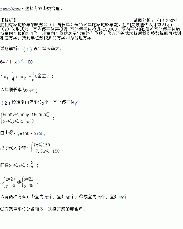 (2)为了缓解停车矛盾,多增加一些车位,该小区决定投资15万元,再造一些停车位.据测算,建造一个室内停车位,需5000元;建造一个室外停车位,需1000元.按实际情况考虑,计划室外停车位数不少于室内车位的2倍,又不能超过室内车位的2.5倍.问,该小区有哪几种建造方案?应选择哪种方案最合理?