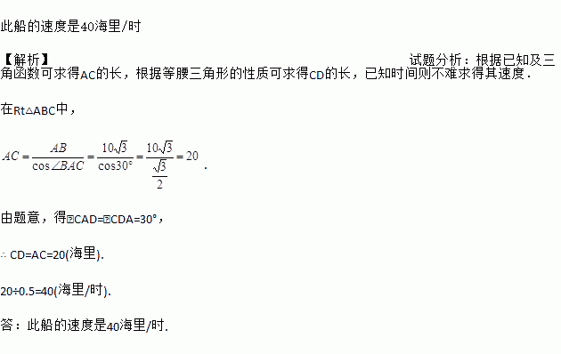 如图,一艘轮船从离A观察站的正北海里处的B港出发向东航行,观察站第一次测得该船在A地北偏东30°的C处;半小时后,又测得该船在A地的北偏东60°的D处,求此船的速度.