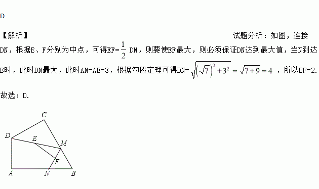 如图,在四边形ABCD中,∠A=90°,AB=3,AD=,点M、N分别为线段BC、AB上的动点,点E、F分别为DM、MN的中点,则EF长度的最大值为( )