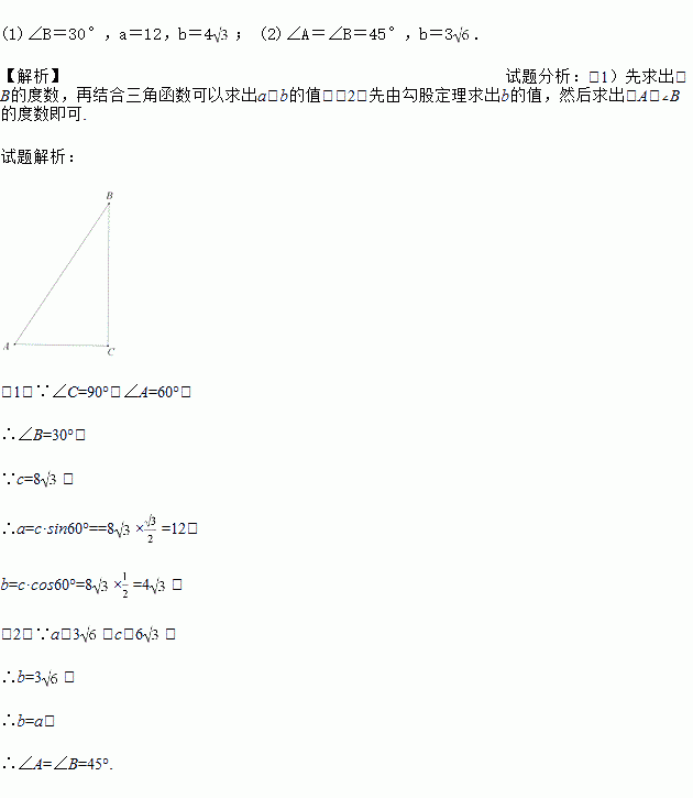(1)已知:c=8,∠A=60°,求∠B及a,b的值;
