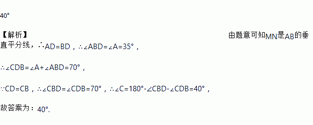 AB的长为半径画弧,相交于两点M.N;②作直线MN交AC于点D,连接BD,若CD=BC,∠A=35°,则∠C=___________________;