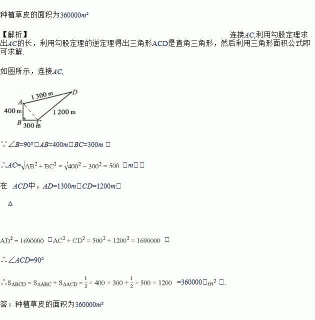 已知某经济开发区有一块四边形空地ABCD,如图所示,现计划在该空地上种植草皮,经测量∠B=90°,AB=400m,AD=1300m,CD=1200m,BC=300m,请计算种植草皮的面积.