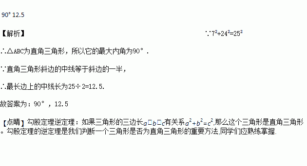 △ABC的三边长分别为7,24,25,则△ABC的最大内角的度数是_________,最长边上的中线长为________.