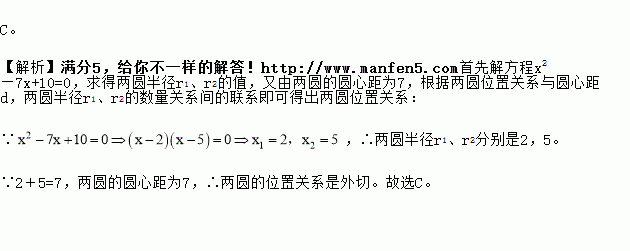 已知两圆半径r1、r2分别是方程x2—7x+10=0的两根,两圆的圆心距为7,则两圆的位置关系是【 】.